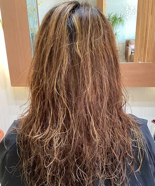 - イルミナカラー/頭浸浴:ムーンライト10.サファリ6.オーキット6を2:1+10%の割合で配合し、オレンジ気味のベースを少し落ち着いたスモーキーグレーにしました☆