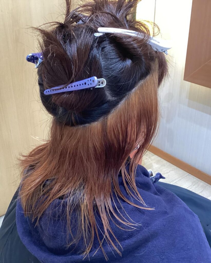 • イルミナカラー/ヘッドスパ:ベースにイルミナアンバー10を3%使用し、インナー部分にイルミナサンセット12+トワイライト12+ディープルビーを1.5%配合しました☆