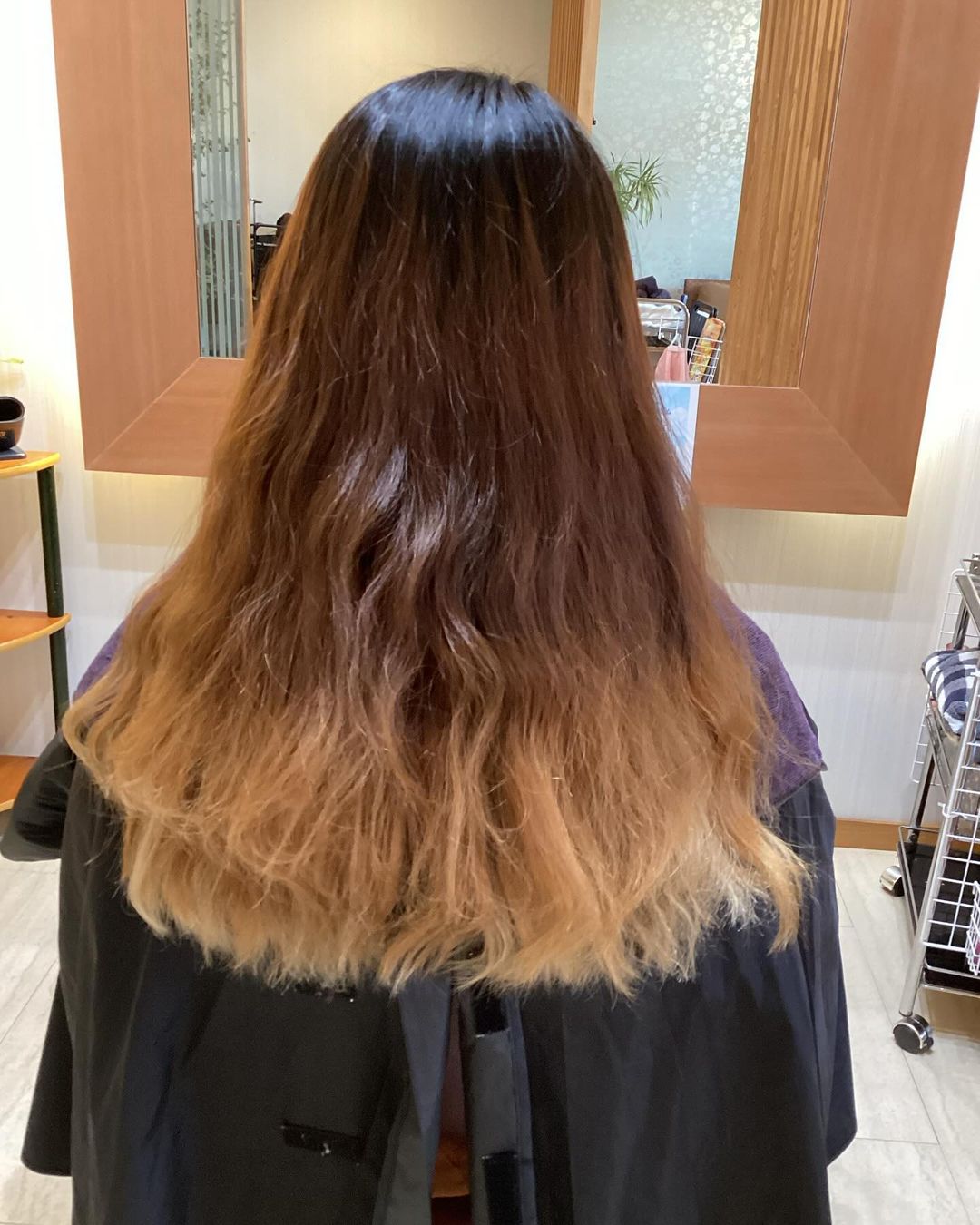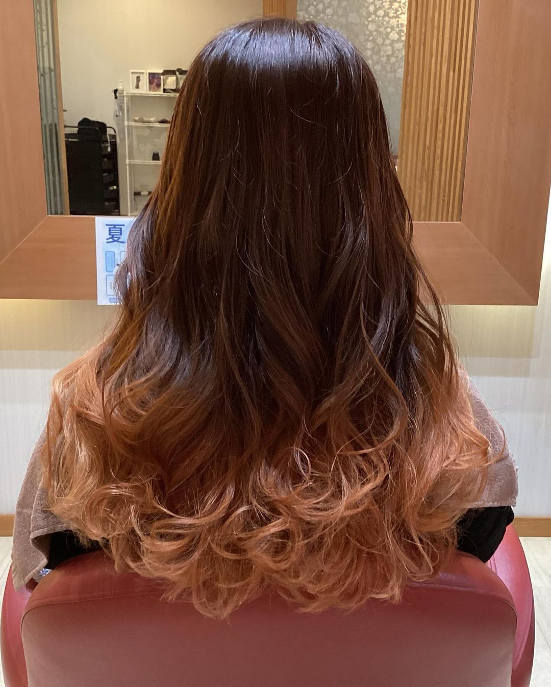 • グラデーションカラー/頭浸浴:髪の根本と中間はイルミナコーラル、毛先はコレストンオレンジでカラーしました。初めて使う色味でしたが綺麗に染まりました♪