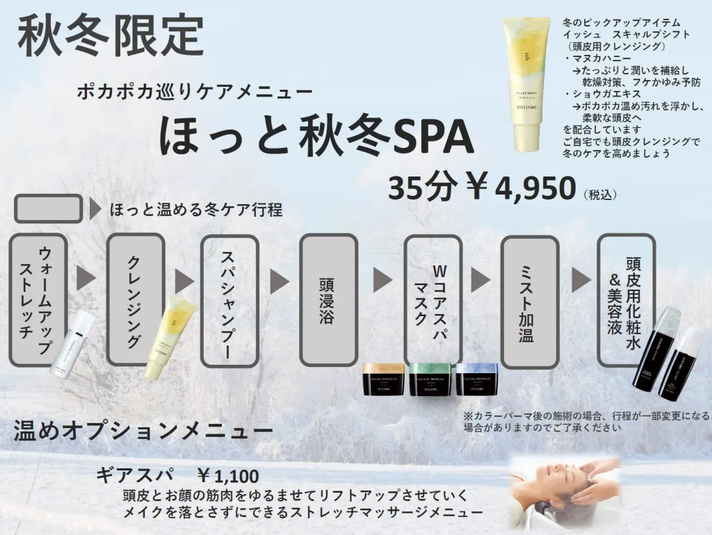こんにちは!郡山市の美容室Lucocoでは、この冬限定の「ほっと秋冬SPA」をご提供します。寒い季節にぴったりなヘッドスパで、頭皮と髪をしっかりとケアし、心も体もリラ... -